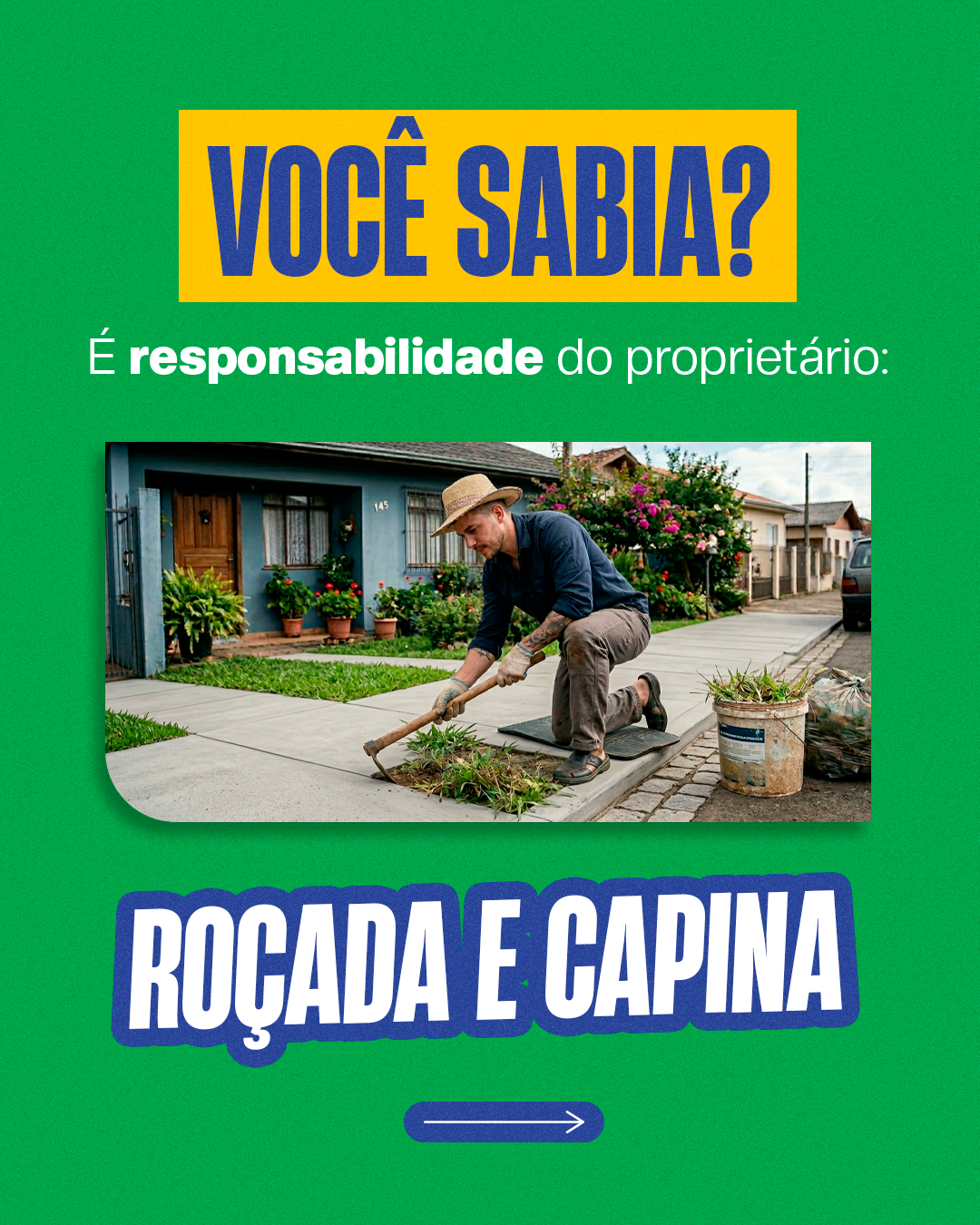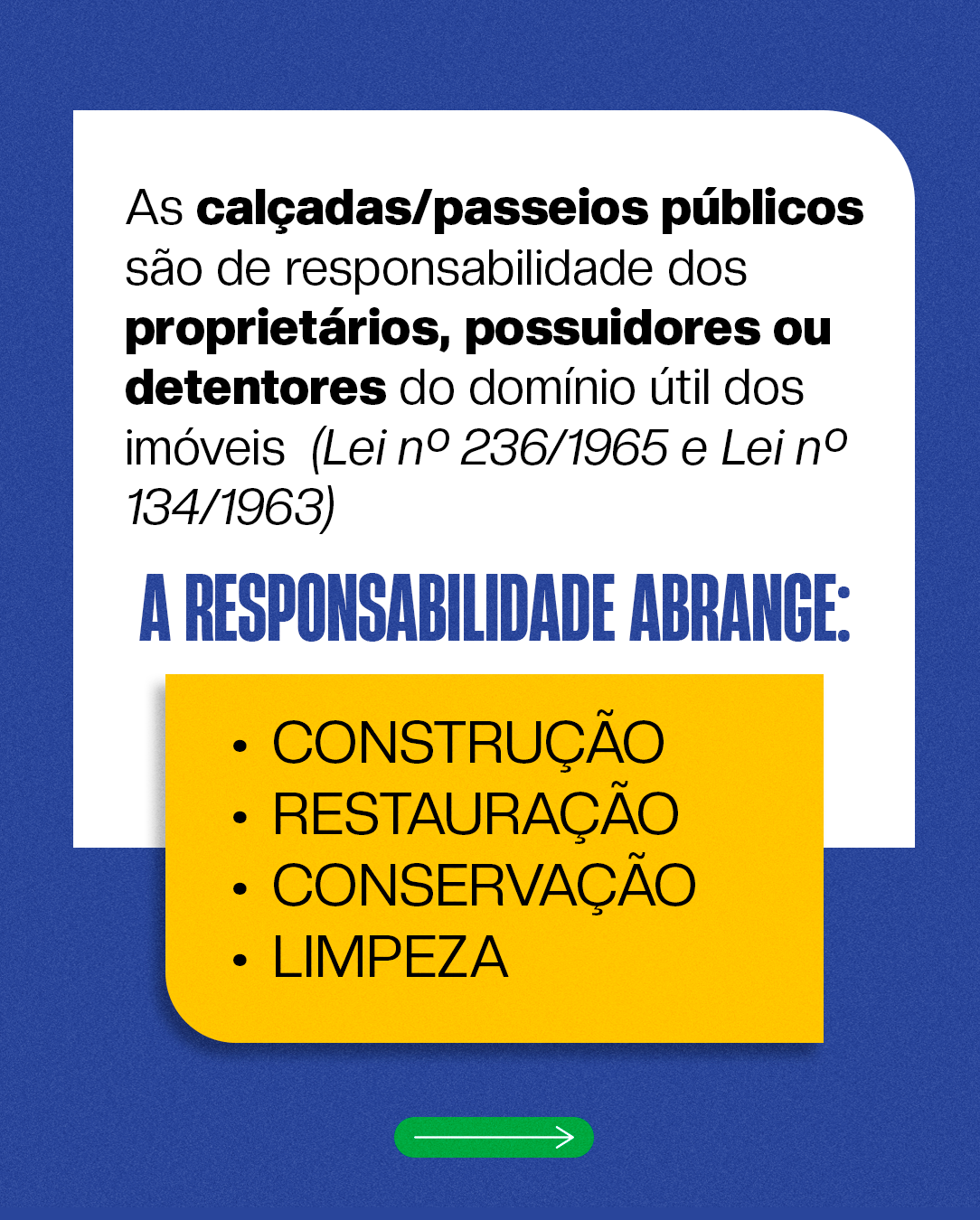 A regra está prevista em leis municipais, como, a nº: 236/1965 e nº: 134/1963, que estabelecem que cabe ao proprietário a construção, restauração, conservação e limpeza das calçadas, que comtempla a poda, roçada e limpeza efetiva dos passeios.