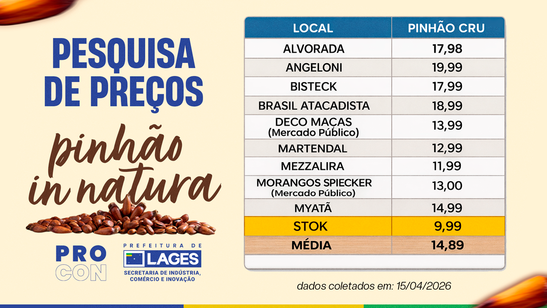 A Prefeitura de Lages, por meio do Programa de Defesa do Consumidor (Procon), vinculado à Secretaria de Indústria, Comércio e Inovação, divulgou nesta semana o resultado de uma pesquisa de preços do pinhão in natura, realizada nesta quarta-feira (15 de abril) em dez estabelecimentos comerciais do município.