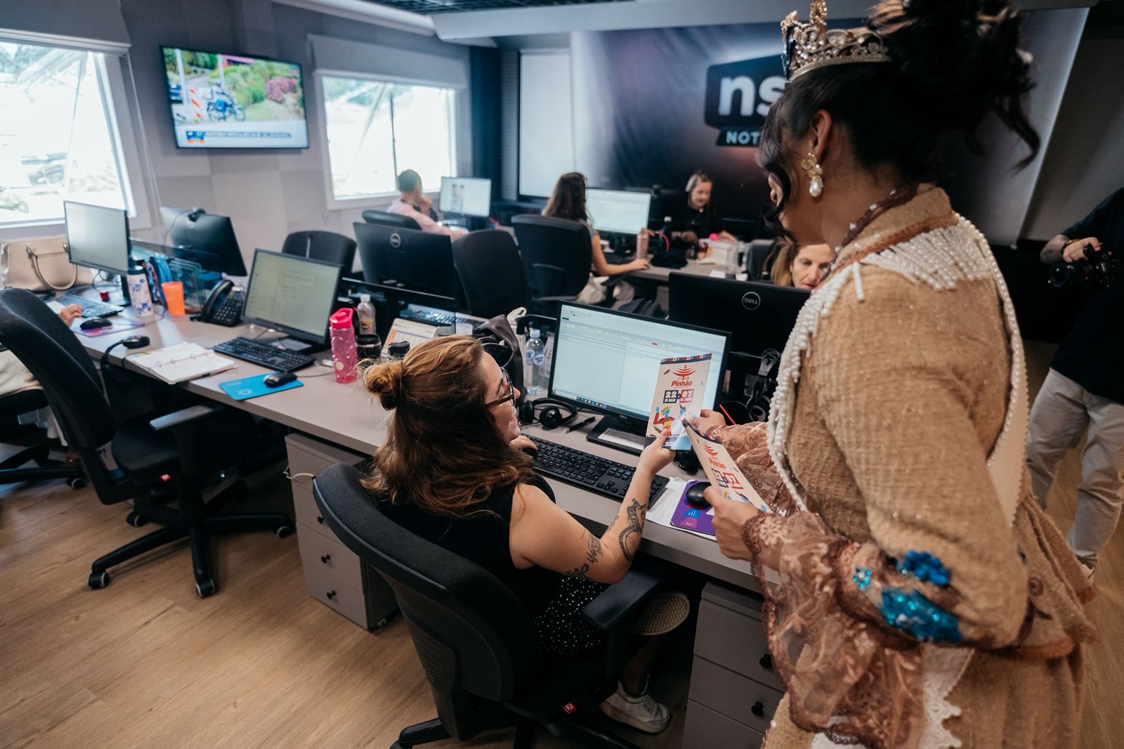A agenda começou com gravações na NSC TV, para o Programa Negócios SC. Na sequência, a realeza participou do Jornal do Almoço e seguiu para entrevistas na Rádio Atlântida. Também foram realizadas visitas aos setores editorial, de marketing e Operações Comerciais (Opec) do grupo, bem como acompanhou-se parte da programação diretamente dos estúdios.