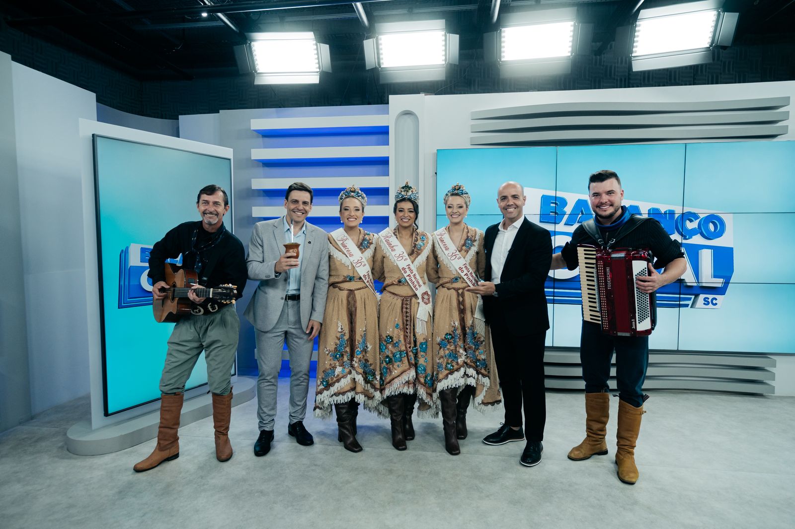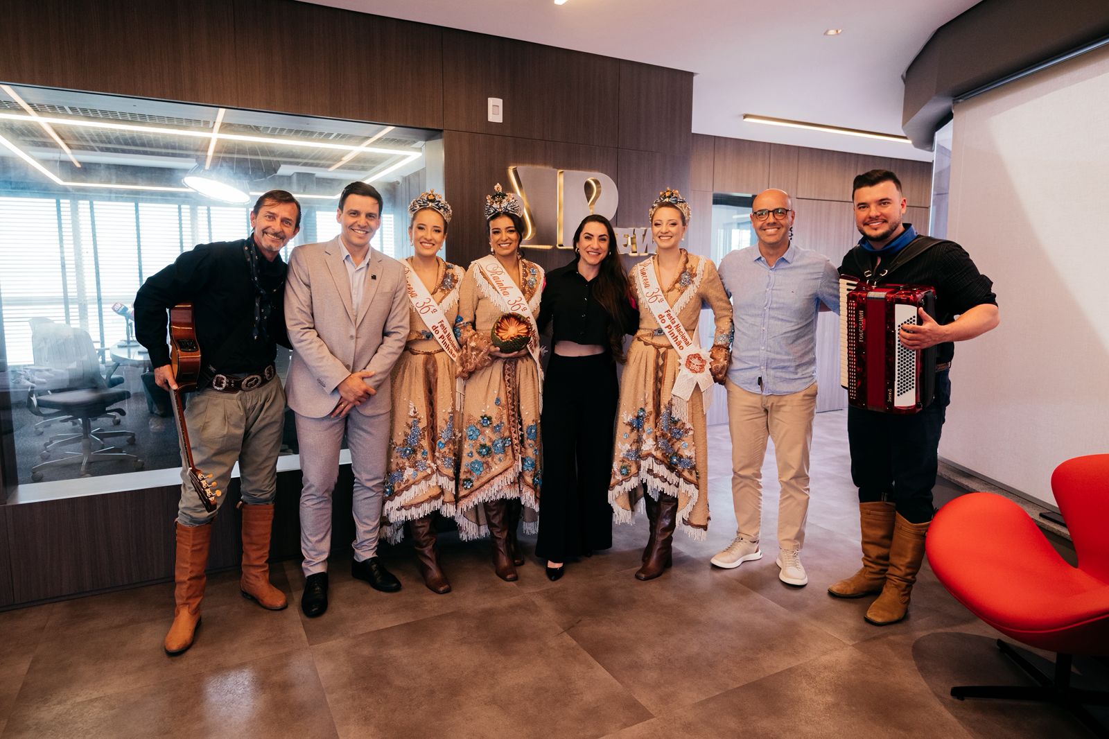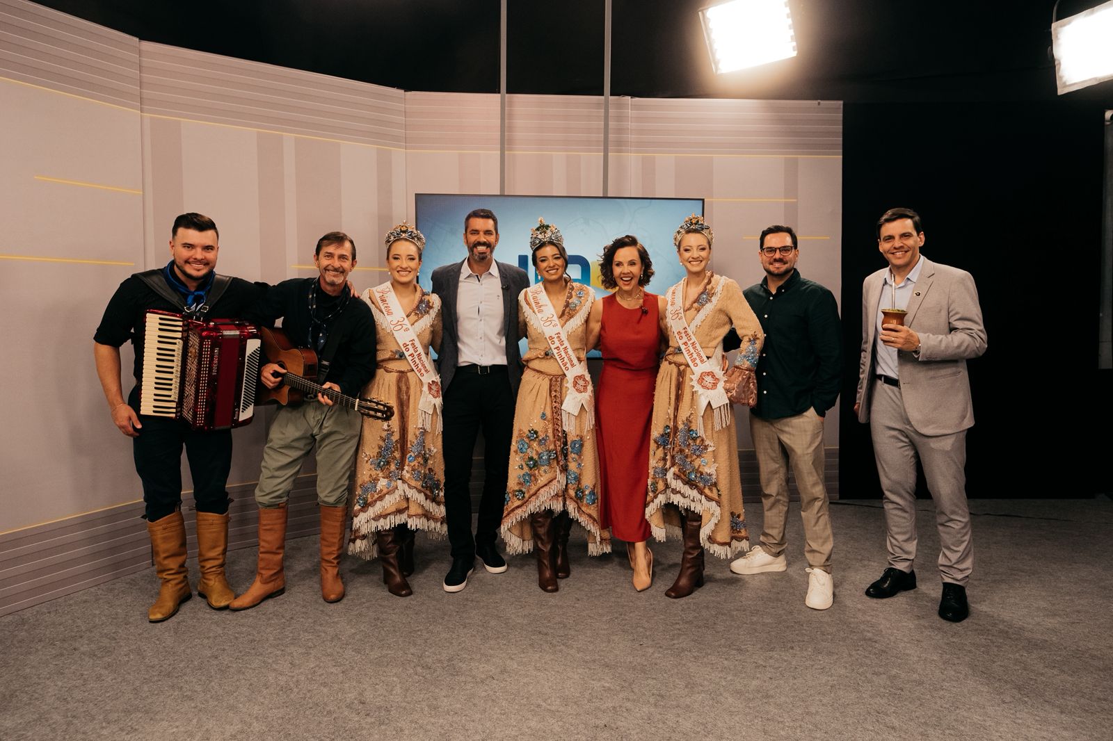A comitiva da 36ª Festa Nacional do Pinhão esteve em Florianópolis nesta quarta-feira (15 de abril) cumprindo uma extensa agenda de divulgação nos principais veículos de comunicação de Santa Catarina. Integrada por membros da Comissão Central Organizadora (CCO), pelo presidente Samuel Ramos e pelo executivo de Comunicação, Diogo Schimitz, além da rainha Maria Júlia Branco da Silveira, e das princesas Maria Luisa Furtado Boeno e Emilie da Silva Pereira, a equipe apresentou a programação e convidou os catarinenses para a Festa.