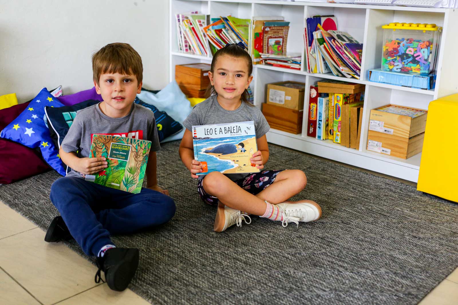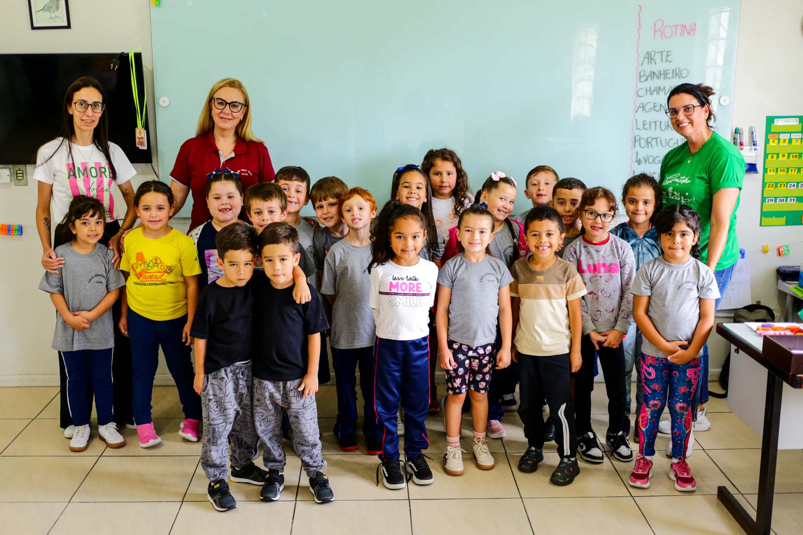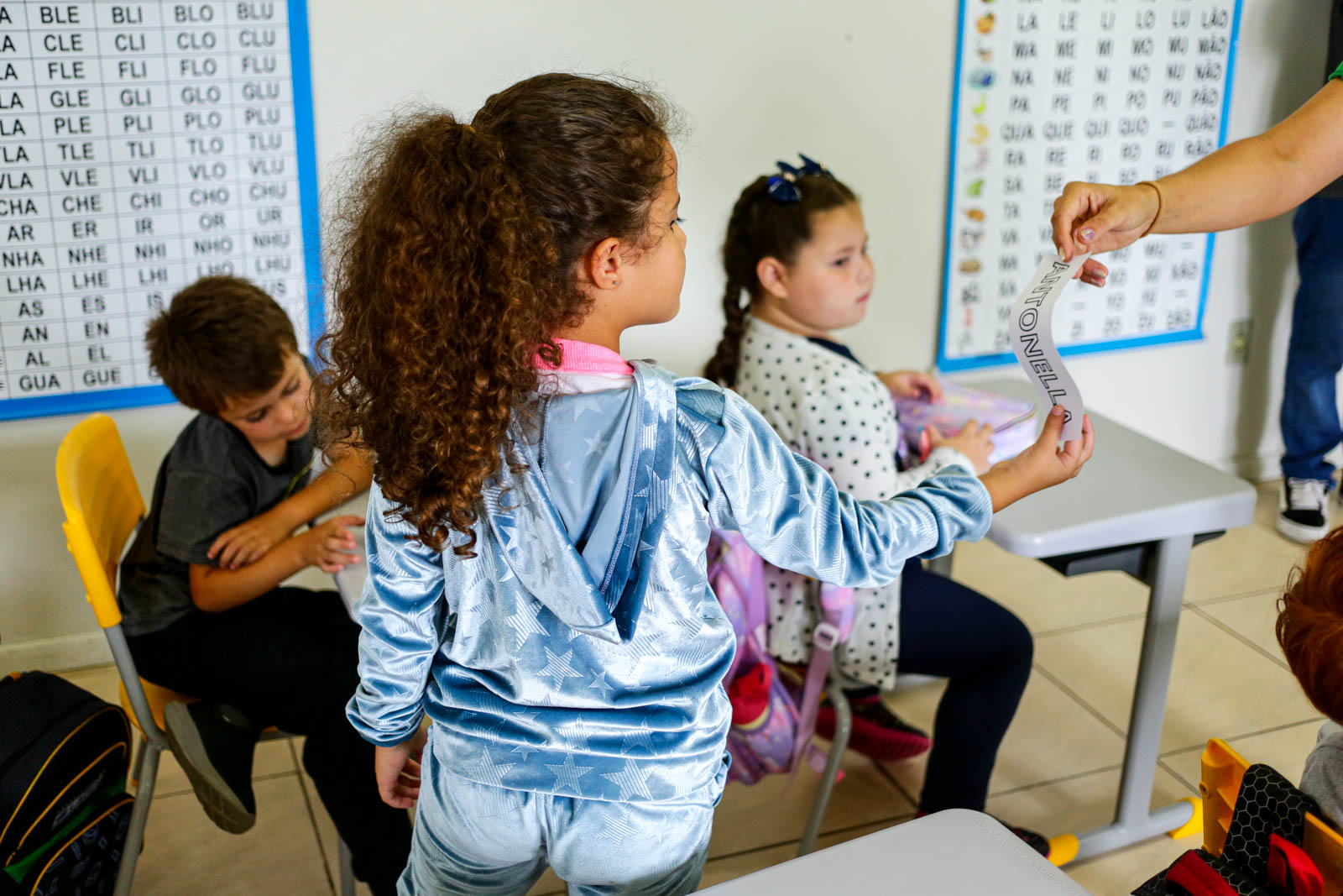 Entre as estratégias adotadas estão leituras compartilhadas e o “Bingo dos Nomes”, no qual as crianças completam suas cartelas conforme as letras são sorteadas. “Trabalho bastante com o nome para que eles possam se conhecer, entender o nome de cada criança. A gente tem o nome na agenda, nos cadernos. Então, eles vão ter aquele entendimento da primeira letra. Quando percebem que o nome do Antony começa com ‘A’, mas que há outro colega com a mesma inicial e precisam olhar a letra seguinte, ocorre o grande salto cognitivo”, finaliza Simara.