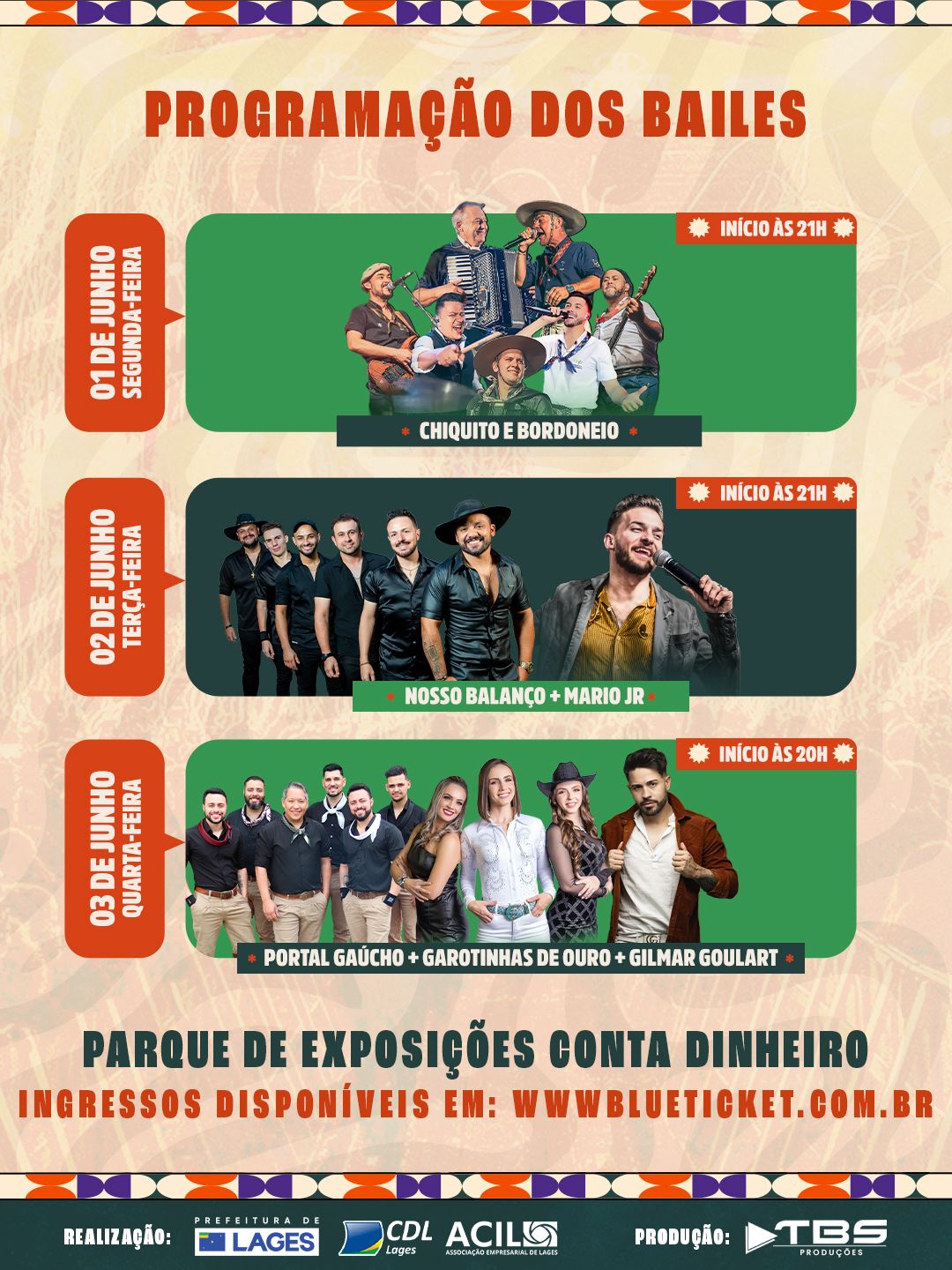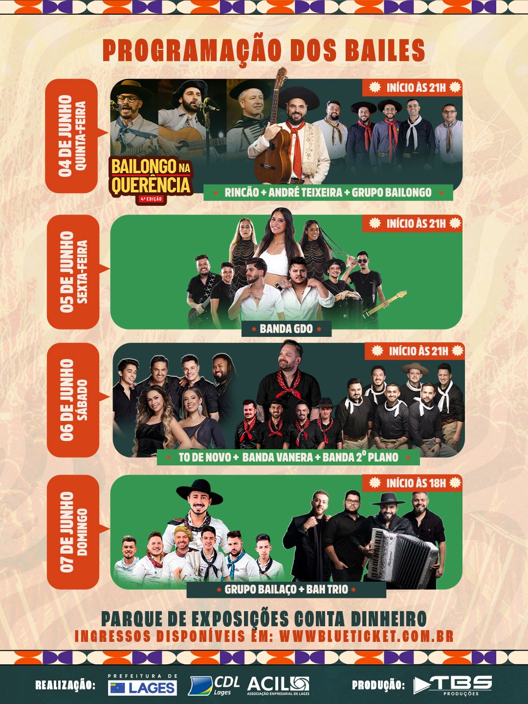 A proposta é oferecer ao público uma agenda dedicada aos ritmos e costumes do Sul do Brasil, com apresentações de grupos regionais e nomes conhecidos do circuito tradicionalista, incluindo bailes com estilos como vaneira, chamamé, xote e bugio. O espaço foi viabilizado por meio de parceria entre a Prefeitura de Lages, a Câmara de Dirigentes Lojistas (CDL) e a Associação Empresarial de Lages (Acil).