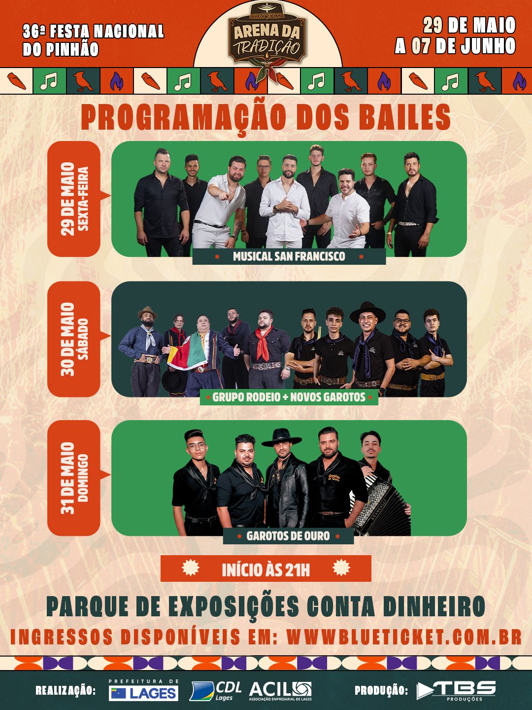 Confira a programação completa dos bailes que ocorrem de 29 de maio a 7 de junho na 36ª Festa Nacional do Pinhão; ingressos podem ser adquiridos antecipadamente pela internet